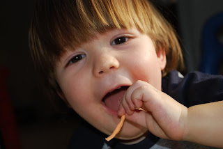 So I finally introduced Caleb to Play-Doh this week. He loved this new toy, though he didn't know just what to do with it at first. Initially, he didn't get into the tactile experience, but tried to stay clean and just arrange/rearrange my creations, and of course, make jokes. By the end of the week, after many play sessions with Daddy, who I must say is more talented at creating Play-Doh creatures than I am, Caleb was getting into the squishing as well.